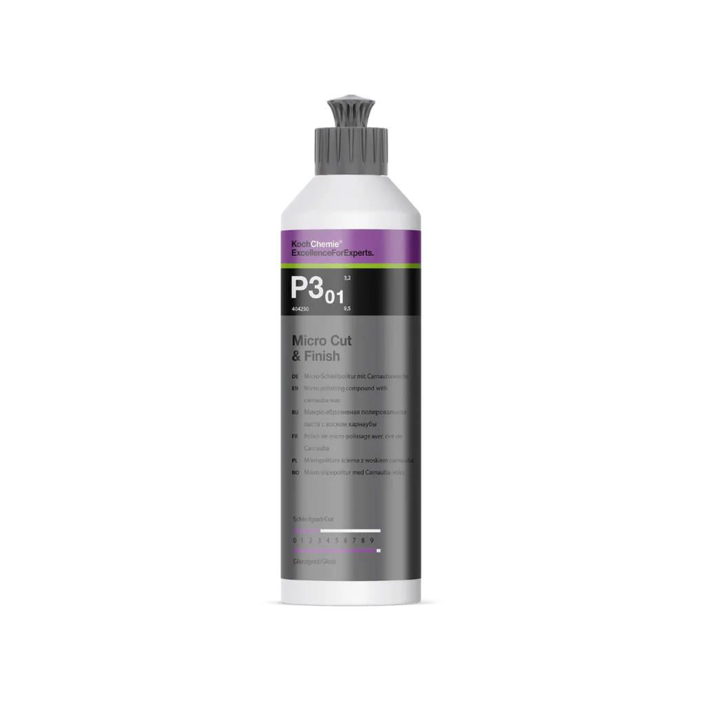 Koch-Chemie Micro Cut & Finish P3.01 is a one-step polish and sealant that is capable of removing 3000 grit sanding marks along with light paint imperfections while simultaneously sealing the finish for long-lasting protection. Thanks to its proprietary abrasive-technology, Koch-Chemie Micro Cut & Finish P3.01 features a long working time and produces an extremely high gloss finish. Koch-Chemie Micro Cut & Finish P3.01 works well on all colors, but it excels on darker colors including black, red, and blue. Koch-Chemie Micro Cut & Finish P3.01 contains carnauba wax and non-fugitive silicones.